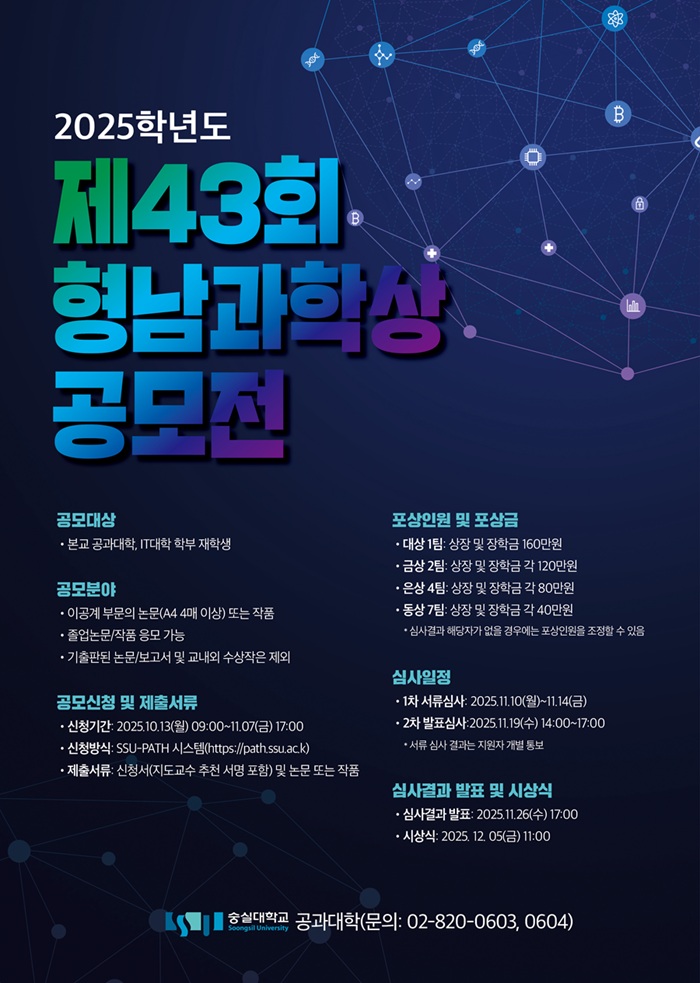 2025학년도 제43회 형남과학상 공모전: 신청기간 10/13(월) ~ 11.07(금) 17:00