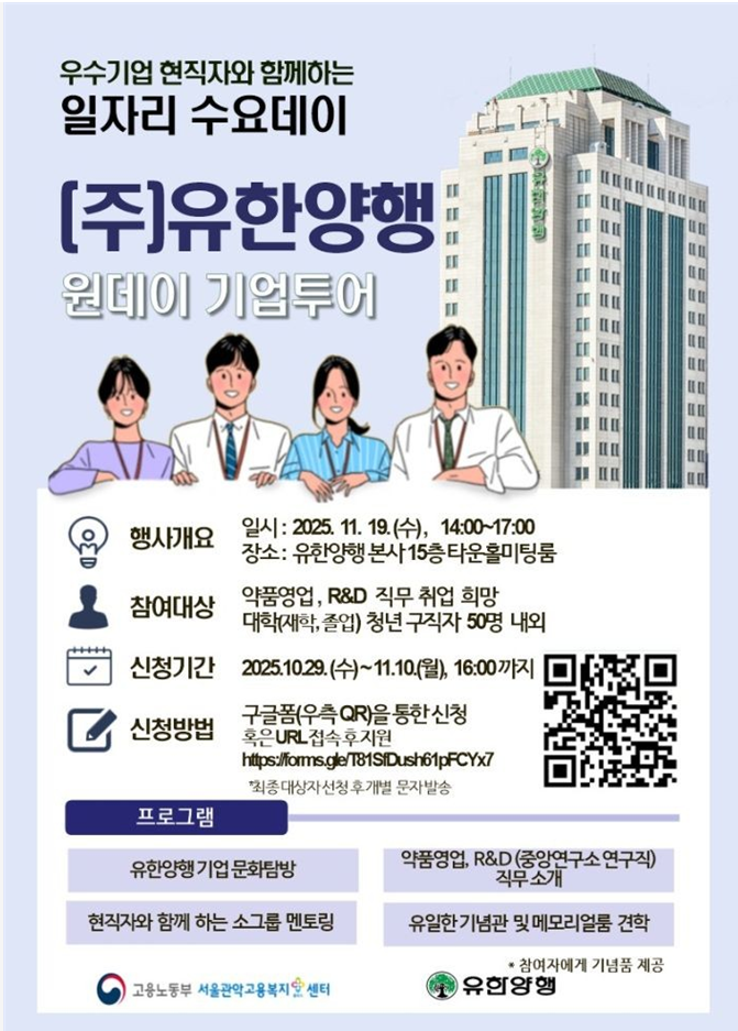 우수기업 현직자와 함께하는 일자리 수요데일 [주]유한양행: 신청기한 10/29 ~ 11/10(월)